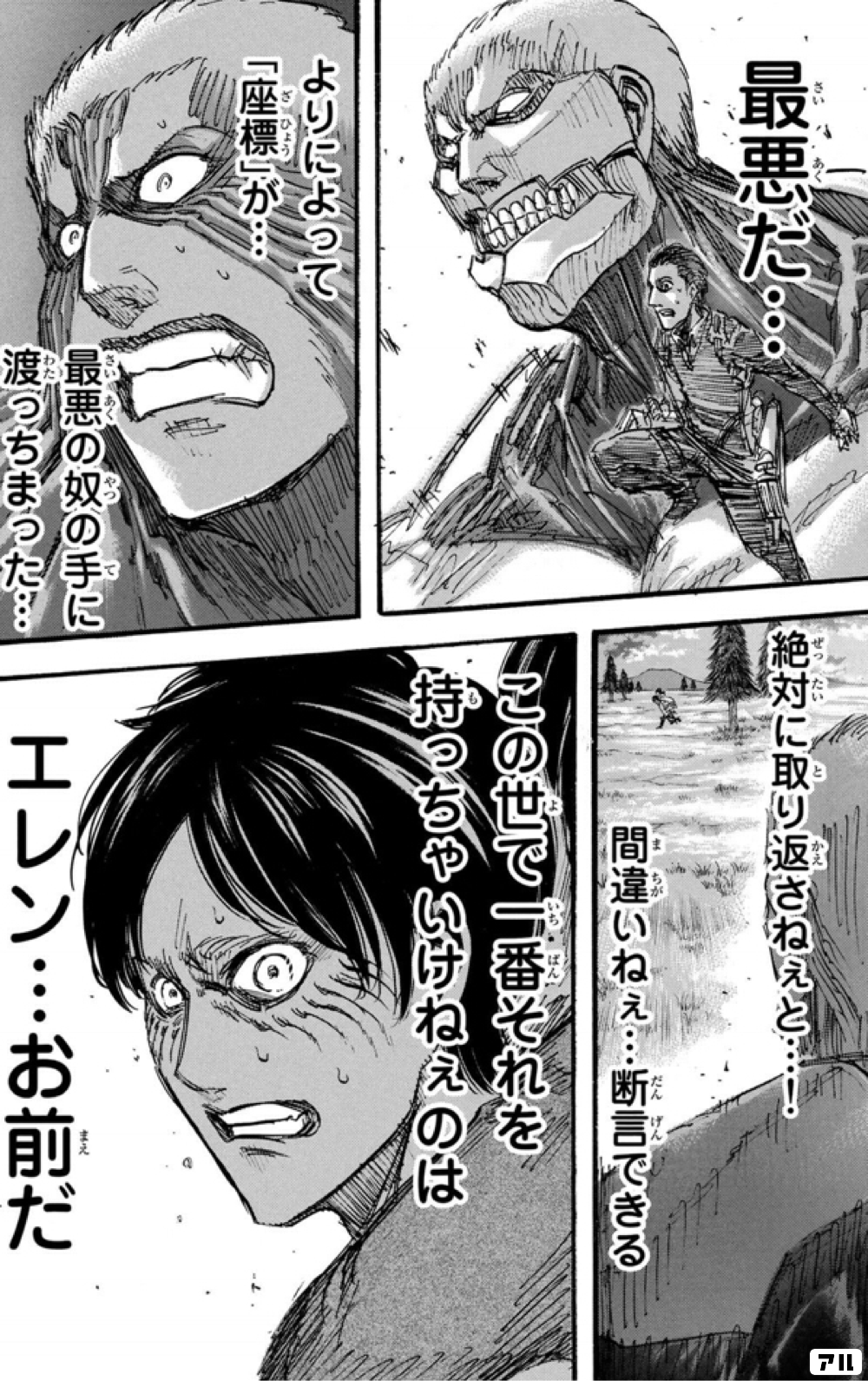 最悪だ よりによって 座標が が 最悪の奴の手に渡っちまった 絶対に取り返さねぇと 間違いねぇ 断言できる この世で一番それを持っちゃいけねぇのは エレン お前だ 進撃の巨人 アル